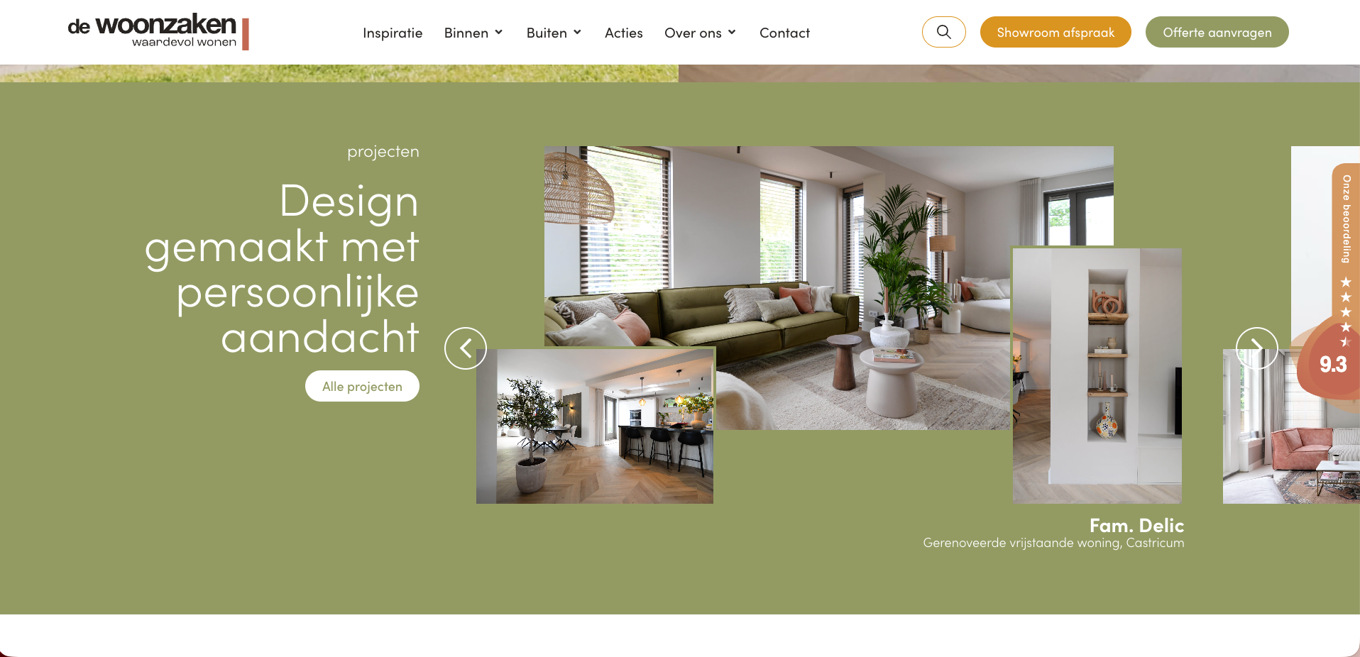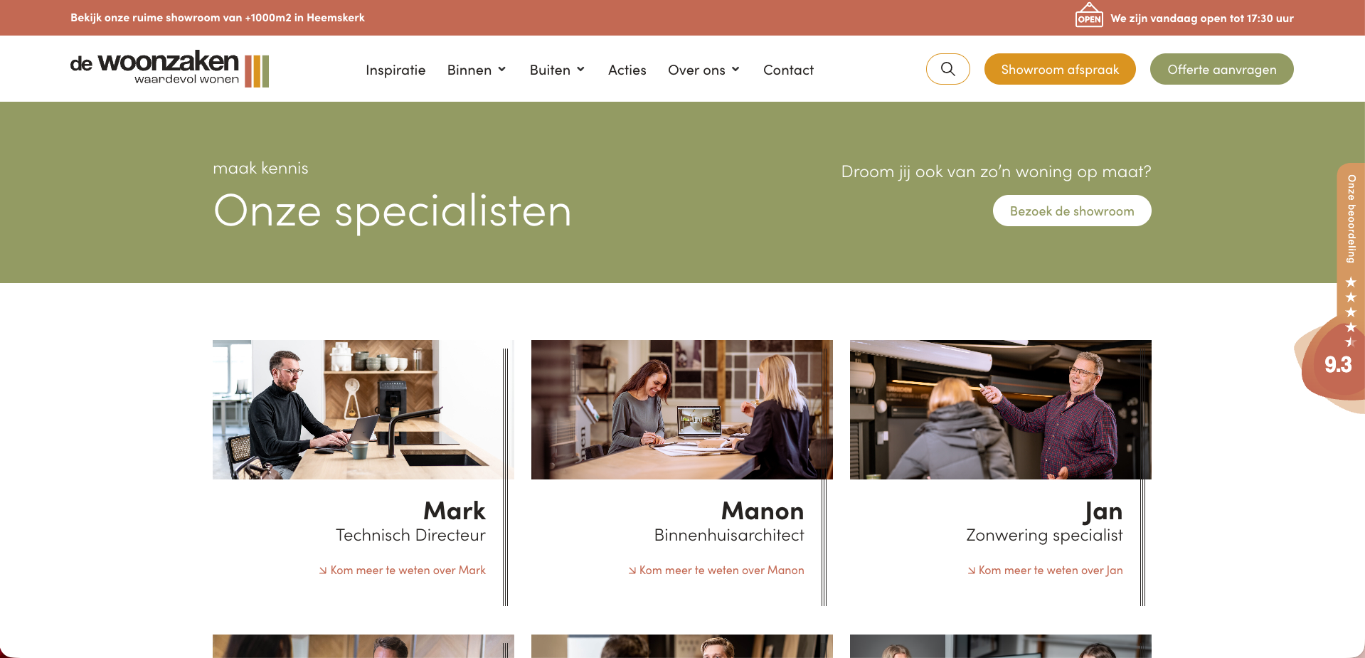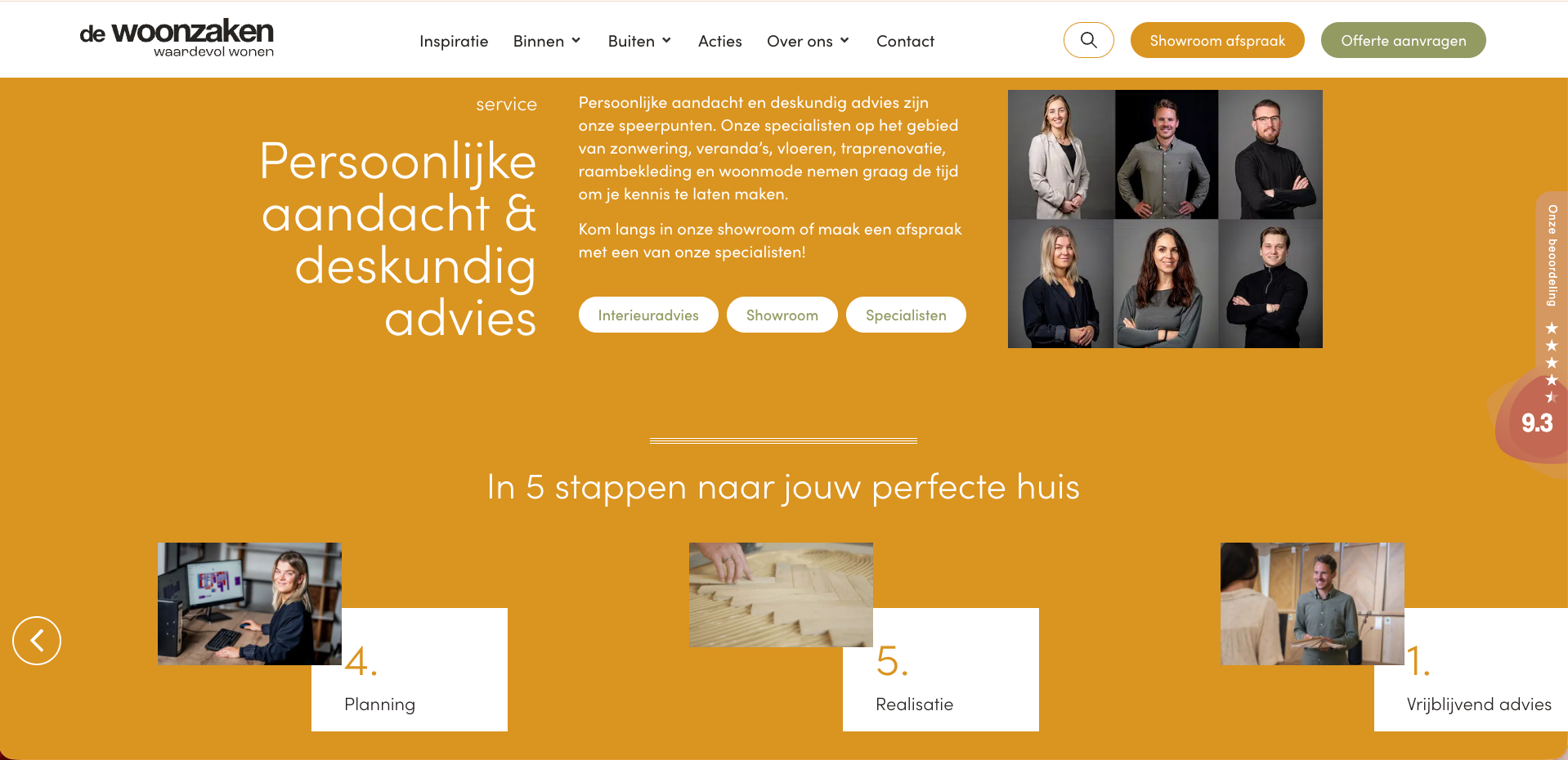 Op de homepage hebben we een duidelijk stappenplan geplaatst: “In 5 stappen naar jouw perfecte huis.” Hiermee laten we zien hoe de Woonzaken klanten begeleidt, van eerste idee tot eindresultaat. In dit onderdeel krijgen ook de gezichten achter het bedrijf een plek. Zo zie je meteen met wie je te maken hebt. Persoonlijk advies staat immers centraal.
