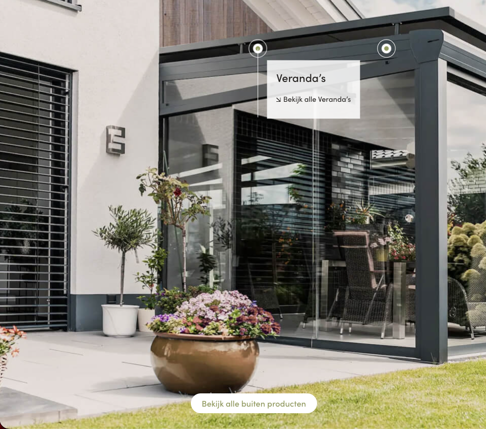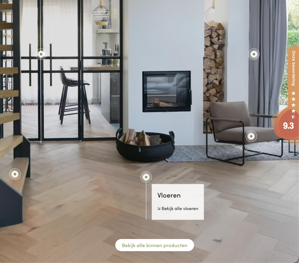 Daarnaast hebben we een interactieve manier toegevoegd om producten te ontdekken. In inspiratiefoto’s staan verschillende elementen uit een interieur, zoals vloeren, gordijnen, meubels en trappen. Via klikbare punten kun je direct doorklikken naar de bijbehorende categorie. Zo ontdek je producten op een natuurlijke manier, midden in een realistische woonsituatie, waardoor gebruikers langer op de website blijven.
