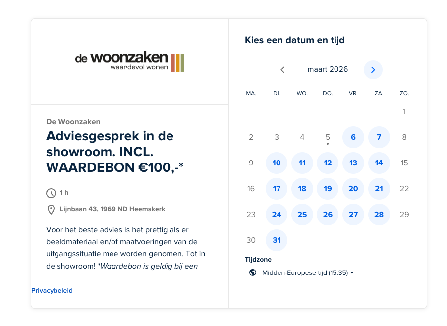 Verder hebben we de website sterk conversiegericht ingericht. Op verschillende plekken op de site staan duidelijke en logische call-to-actions die bezoekers helpen bij de volgende stap. De belangrijkste actie is het plannen van een showroomafspraak. Via een geïntegreerd Calendly-formulier kan dat snel en eenvoudig, precies op een moment dat voor de bezoeker uitkomt.