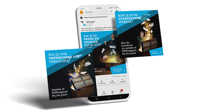 Om het concept vervolgens tot leven te brengen gingen we op zoek naar een echte schatkist en een geschikt model. Ook een medewerker van DOXsupport nam plaats achter de camera. De foto’s werden ingezet om de Werken bij-pagina op hun website te verbeteren, een social media-campagne mee op te zetten en de matchtest vorm te geven. Daarin lieten we potentiële kandidaten aan de hand van een paar vragen op een laagdrempelige manier kennismaken met het bedrijf. De antwoorden op deze vragen verschafte DOXsupport handige inzichten.