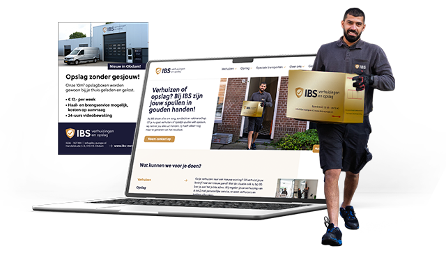 Bij IBS draait alles om zorg, aandacht en professioneel vakmanschap, of het nu gaat om een verhuizing of opslag. Vanuit dat uitgangspunt bedachten we het concept ‘goud in handen’. Want bij IBS zijn jouw waardevolle spullen écht in goede, of beter gezegd: gouden handen. Dat concept hebben we geïmplementeerd in verschillende uitingen. Het nieuwe logo ademt kwaliteit en vertrouwen, met een subtiele knipoog naar het goudconcept. In de huisstijl zie je gouden accenten en warme, luxe tinten terug gecombineerd met een heldere en toegankelijke uitstraling.