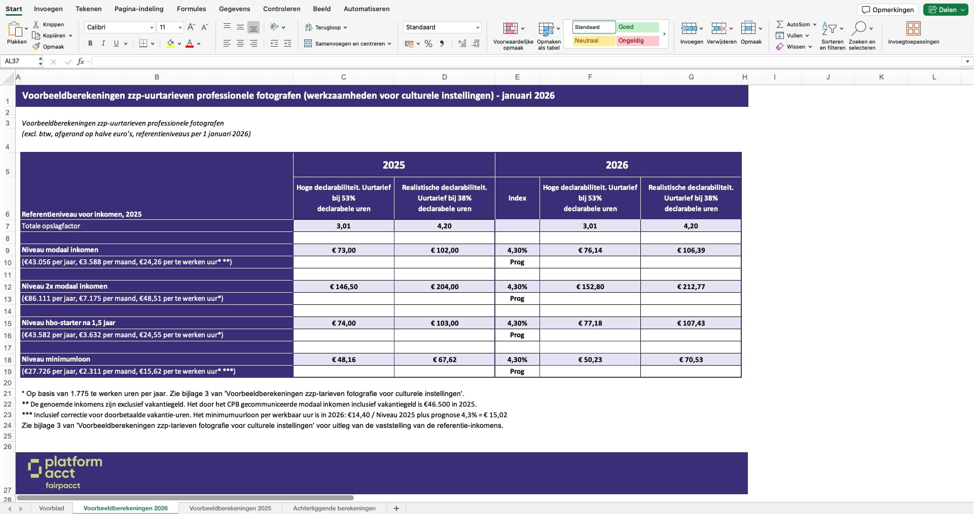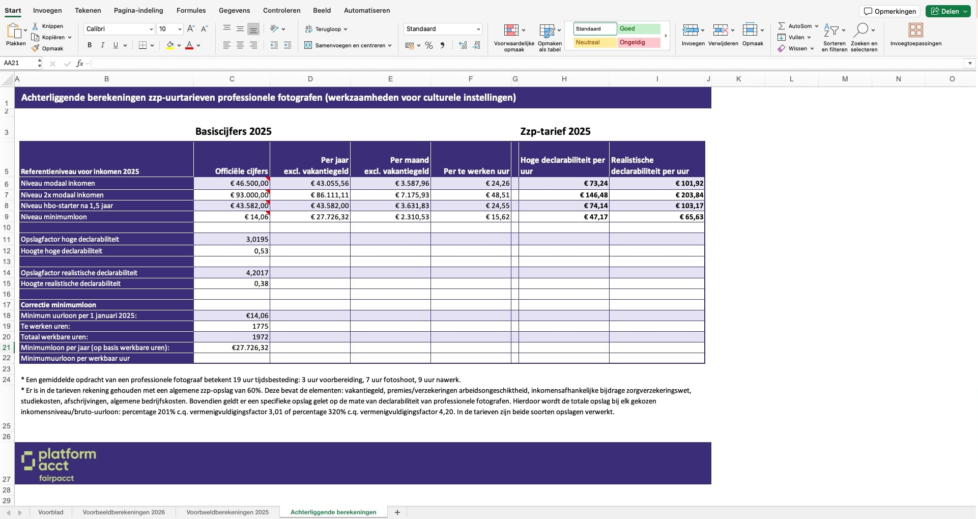 Om een goede rekentool te kunnen maken moet je precies weten wat je wilt doorrekenen. Onderzoekbureaus hadden voor Platform ACCT al grondig uitgezocht wat eerlijke tarieven zijn binnen de sector. Denk aan verschillen tussen de beroepsgroepen, ervaringsniveaus en soorten opdrachten. Met al die informatie zijn wij aan de slag gegaan om de logica te structureren en te vertalen naar heldere tabellen in Excel.