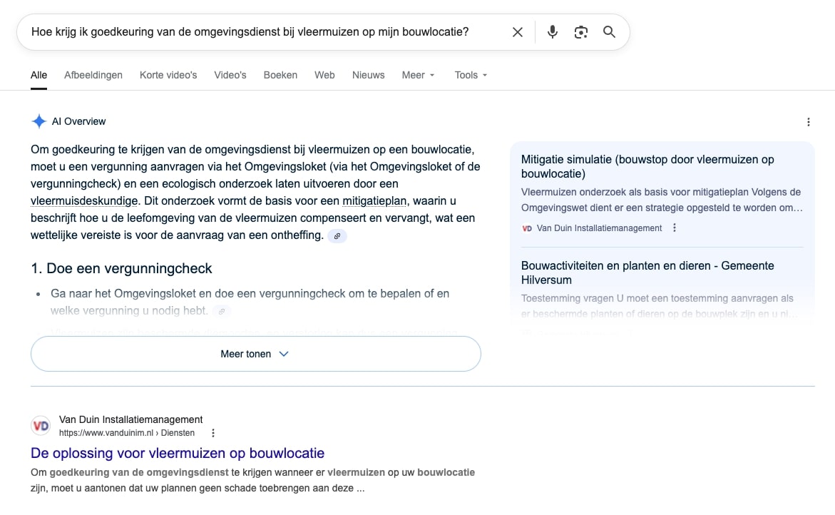 Daarbij is de pagina nu ook zichtbaar in de AI-resultaten van Google. Die positie wordt niet zomaar weggegeven: alleen waardevolle, relevante content wordt opgenomen in deze overzichten.