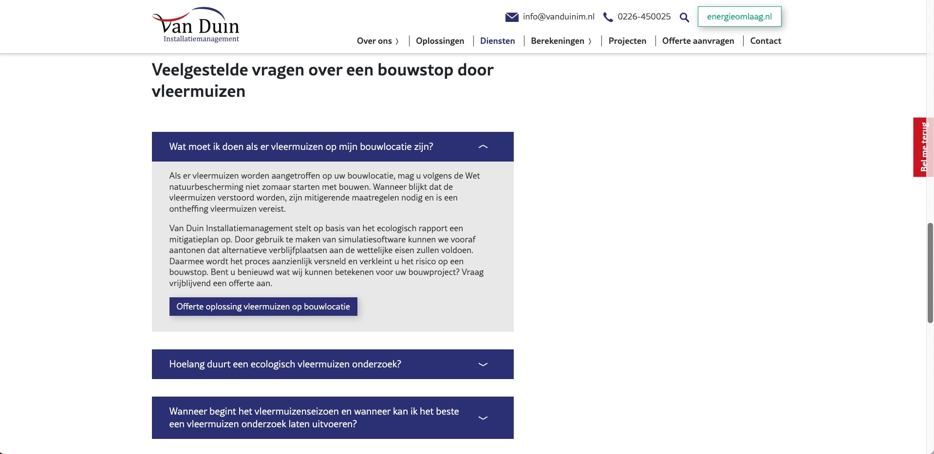 In deze case laten we zien hoe we hun dienst, mitigatie simulatie, onder de aandacht brengen bij de juiste doelgroep. Met deze dienst kan Van Duin in plaats van het uitvoeren van metingen, met behulp van geavanceerde software de bestaande en nieuwe verblijfplaats van de vleermuis nabootsen. Er kan vervolgens berekend worden of de nieuwe verblijfplaats zal voldoen aan de geëiste criteria, zoals de juiste temperatuur. Door dit te kunnen voorspellen wordt het proces aanzienlijk versneld. Het is hierdoor niet meer nodig om tijdrovende, handmatige metingen uit te voeren waardoor een onnodige bouwstop door vleermuizen voorkomen kan worden. Deze werkwijze is al meerdere keren door de Omgevingsdienst goedgekeurd.